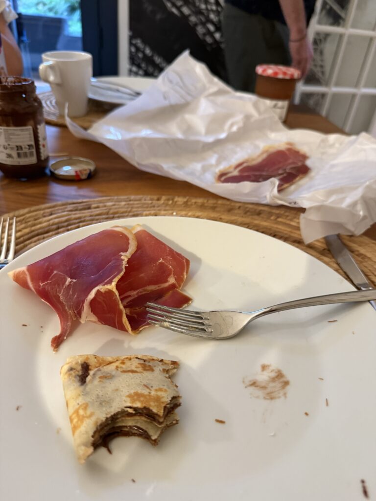 After a quick stop home we walked to a restaurant in Pibrac to meet Florian after work. They explained that this bistro is connected to the boucherie next door. They close the shop at 12:30 and walk over to open the bistro for lunch, and back and forth each day. So they assured me the meat is top quality. On their recommendation I ordered the duck with today’s legumes, endives, in place of frites. I was pleased they let me pay for dinner as thanks for their hospitality. Then back home to finish packing. And that was the day! Tomorrow we wake extra early for our 8am train direct to Paris (no finicky connections this time 🤞).