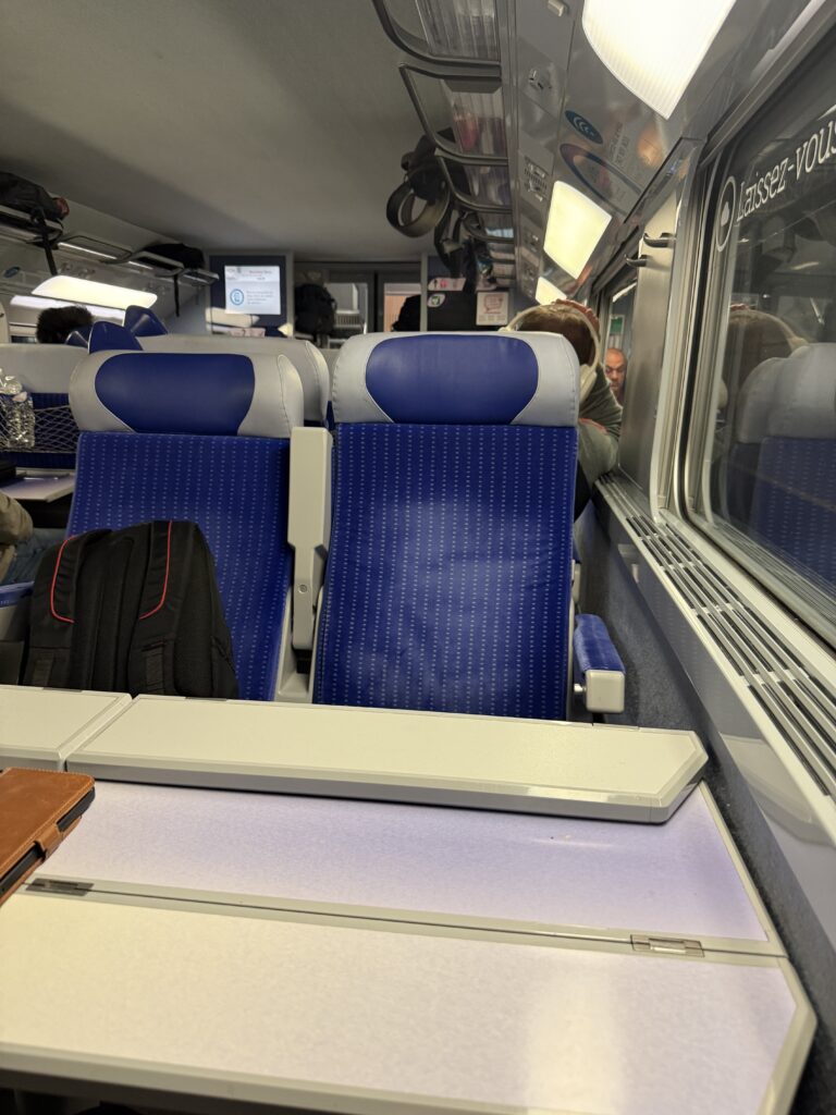 this morning we woke up extra early to drive with rush-hour traffic to our train leaving at 8 AM. It was raining heavily. The TGV train to Paris was very nice! We had first class seats that were wide and comfortable. I enjoyed watching the French countryside change from forest to fields as we got closer to the city. I was surprised the route took us all the way to Bordeaux! So I practically went from one side to the other. I wish we had been close enough to see the western bay. According to the train conductor, because of the rain our train was slowed. So instead of a four hour journey, it took a little over six hours. We had a simple lunch on board from the café in car four.