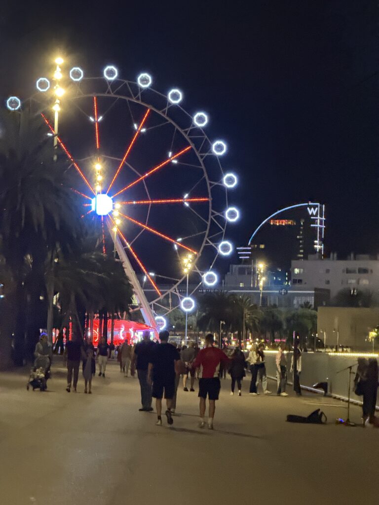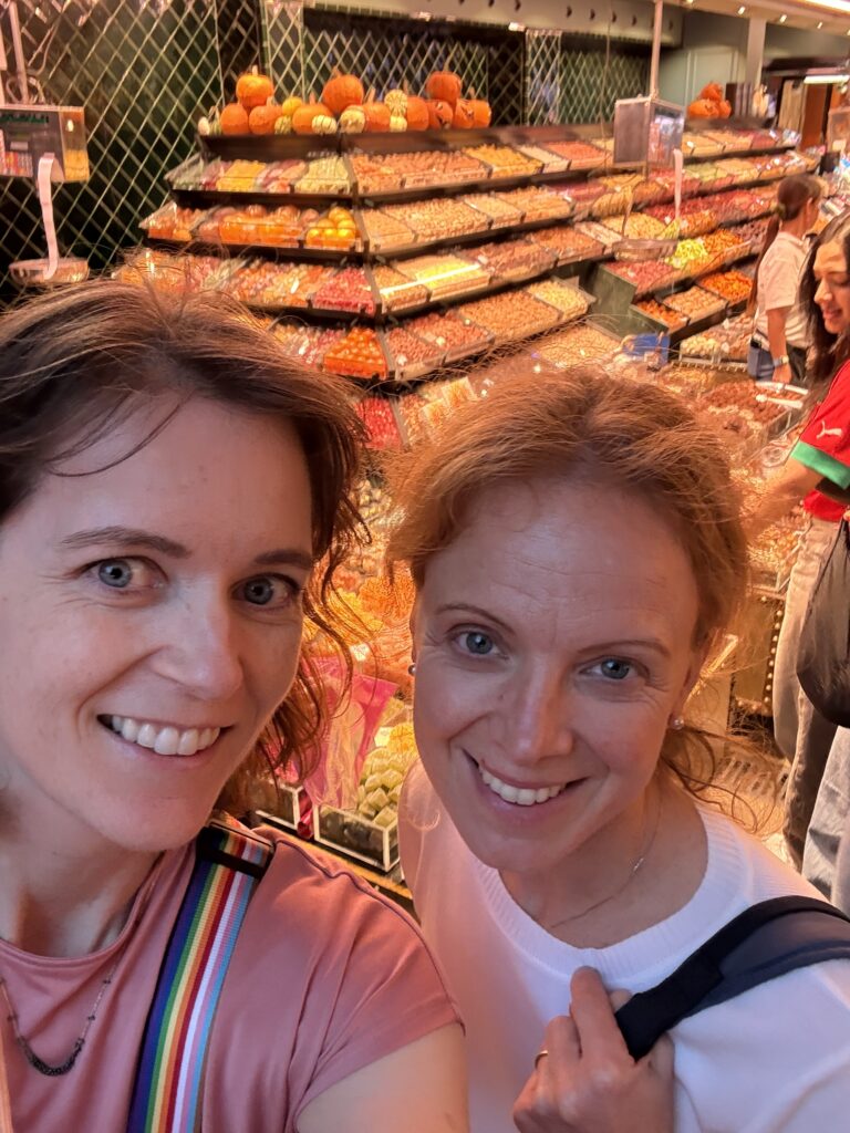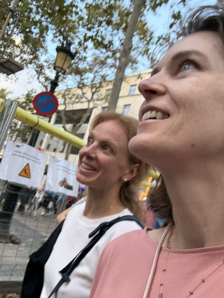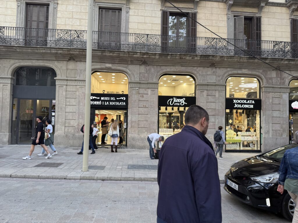 With the city downhill, we decided to explore the city by walking back to the hotel and beyond. I found a yarn shop and bought some yarn for socks! I liked a French skein but it’s a brand available in Colorado, and I’m not in France, so I chose a more unique skein from Katia. We needed to rest and met that with some light snacks and an outdoor table. Fortified, we continued on to La Rambla. She helped me pick out a sweater and kerchief from a European chain store “Mango.” We bought chocolates at the shop we sampled last night.