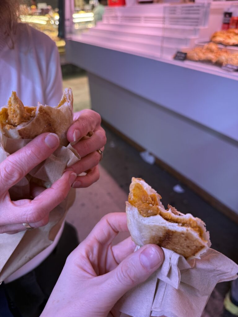 I sipped my hot chocolate while reviewing the airport route and retrieving my luggage. With my huge IKEA bag of dirty clothes I made the trip to my hotel without too many wrong turns. I had my vegan Mediterranean sandwich (tough bread, delicious fillings) a citron tartelette (meh). and a “cigare” from a middle eastern shop in the fancy GL food shops (soooo good).