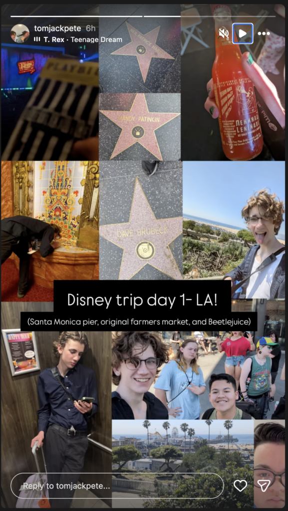 Jack went on a school trip to California over spring break. The performing arts (theater, choir, orchestra, band) were all invited for a trip to Hollywood to see Beetlejuice with a Q&A session, to Universal Studios, and to Disneyland, including a learning session at the Disney Academy. He had a total blast. I don’t have much to say, I’m just going to dump in some of his photos. Sorry these are in reverse order!