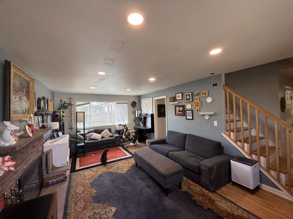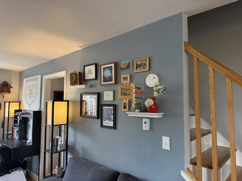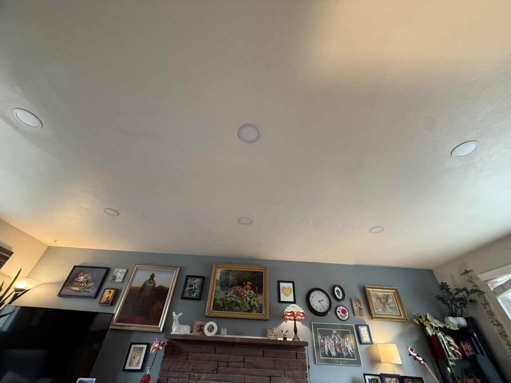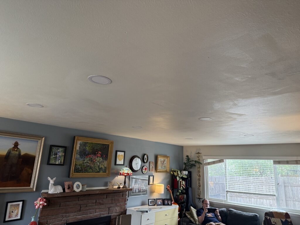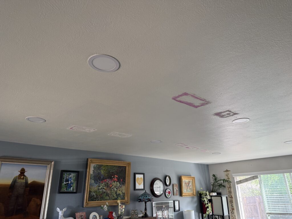 The last project here was a longtime dream. Our living room is so dark, even with 5 lamps illuminating it. I can’t embroider or knit at night because I can’t see! I had an electrician install LED wafer lights and I LOVE it. I planned to do the drywall repair myself, having learned some basics after our basement repair and the kitchen wall disaster. I didn’t do a very good job. I should have spent time leveling all the pieces, instead of assuming I could mud and paper them to blend in. I’m fairly unhappy with it and might scrape it off one day if it for a do-over. But after two days of work (mostly waiting for things to dry between layers) I wanted to move on. Good enough.