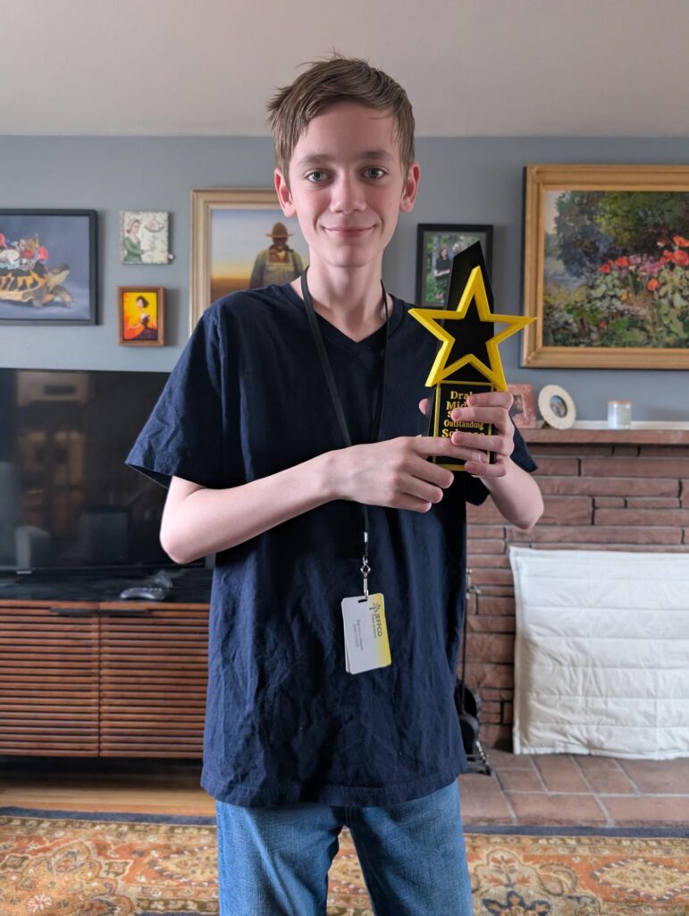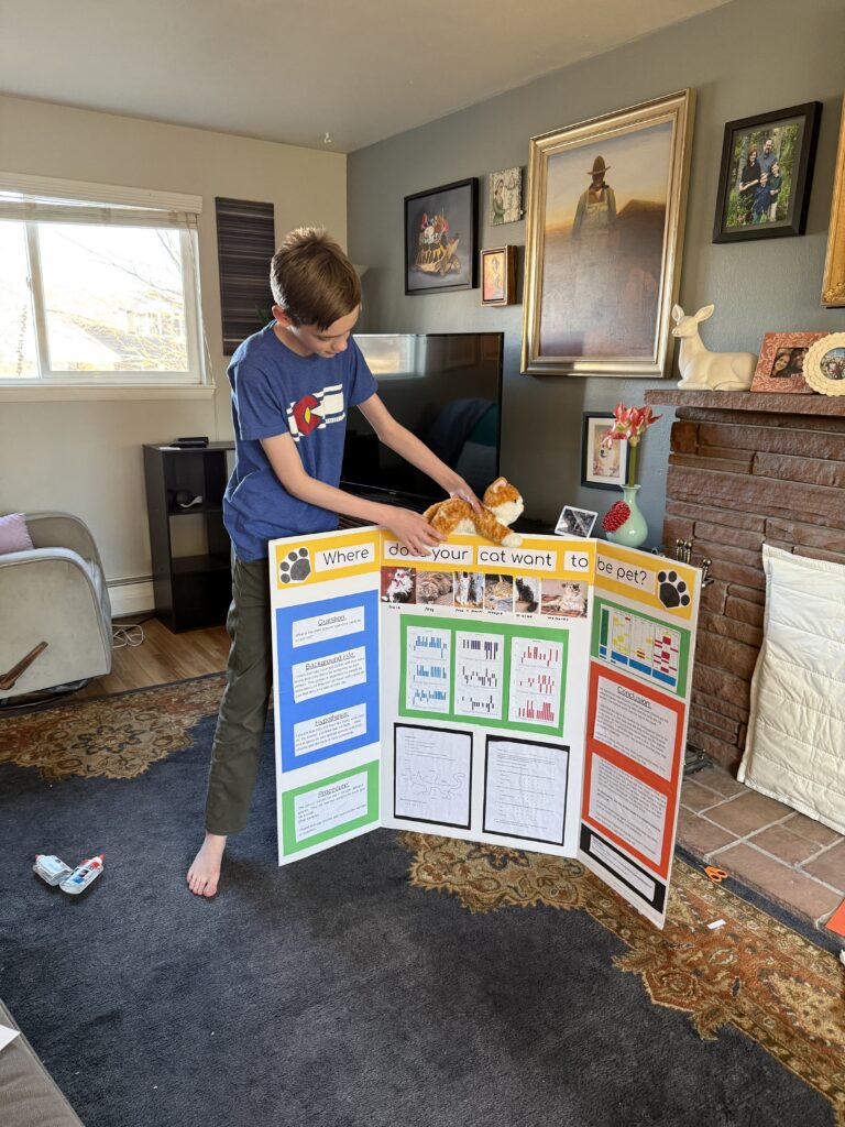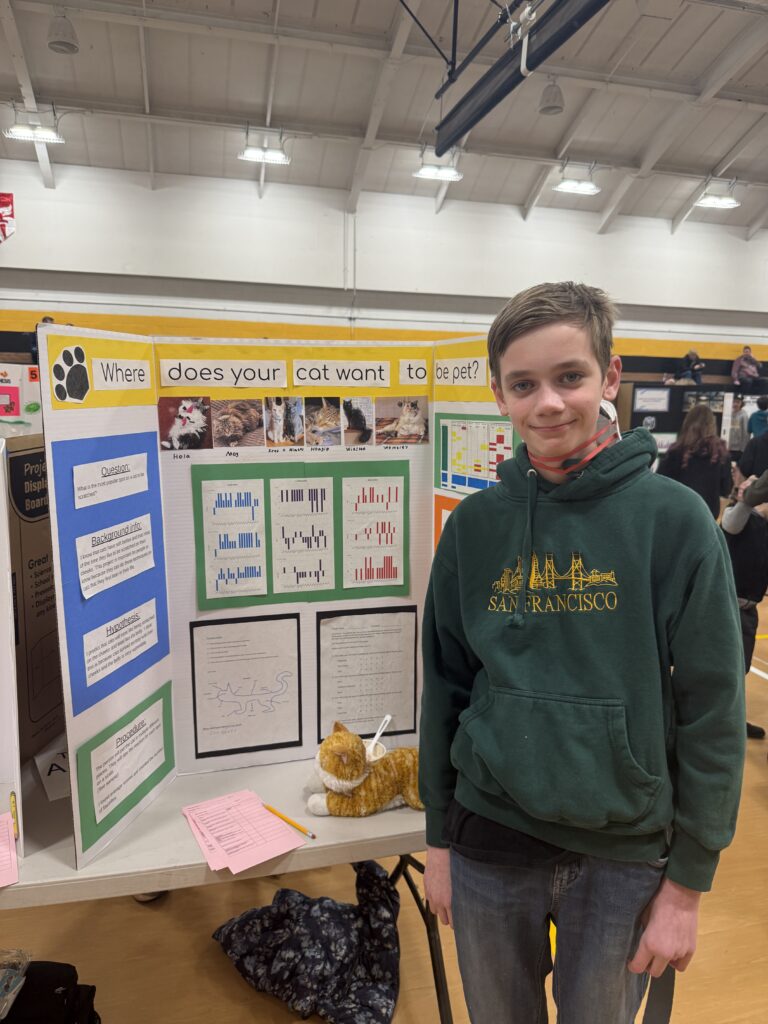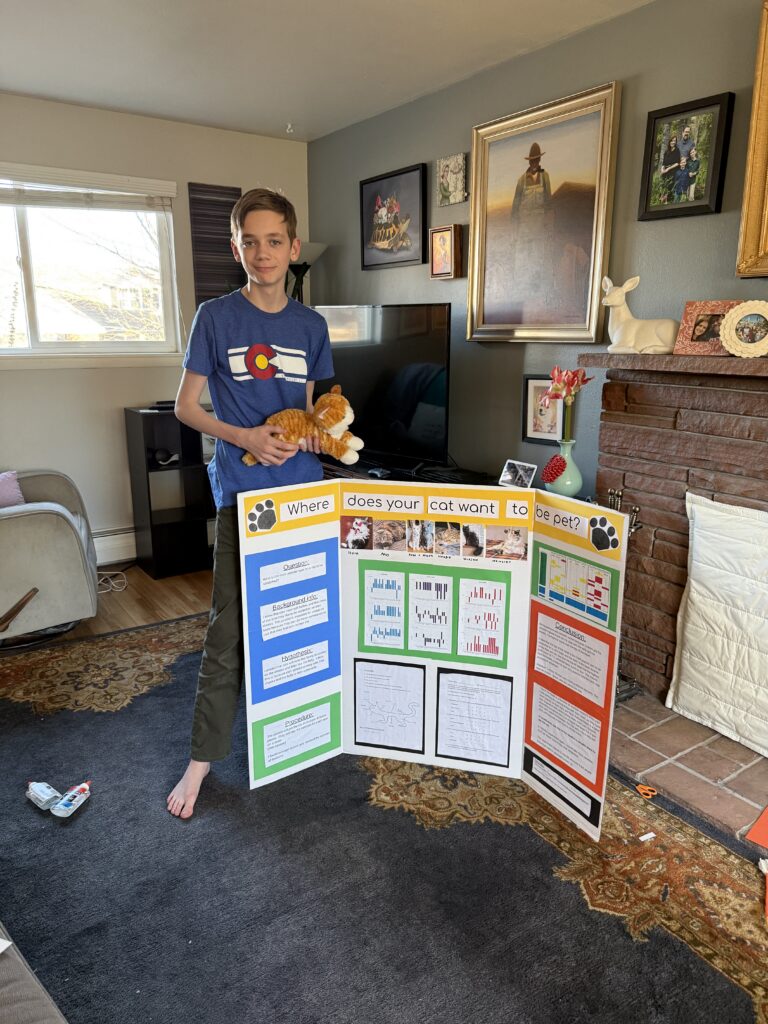Sam participated in his school’s Science Fair as a seventh grader. He wanted to study the best regions to pet cats. We solicited many friends and family to gather data for his research. I helped with with the study design and Ben help with the graphs. He put together a fantastic project board and did a great job presenting at the fair. The science teachers gave him great feedback during the fair. Days later he was surprised to receive an award for “winning” the fair! Way to go, Sam!!